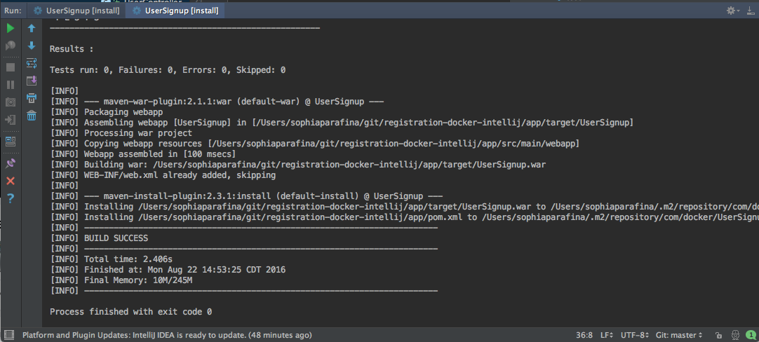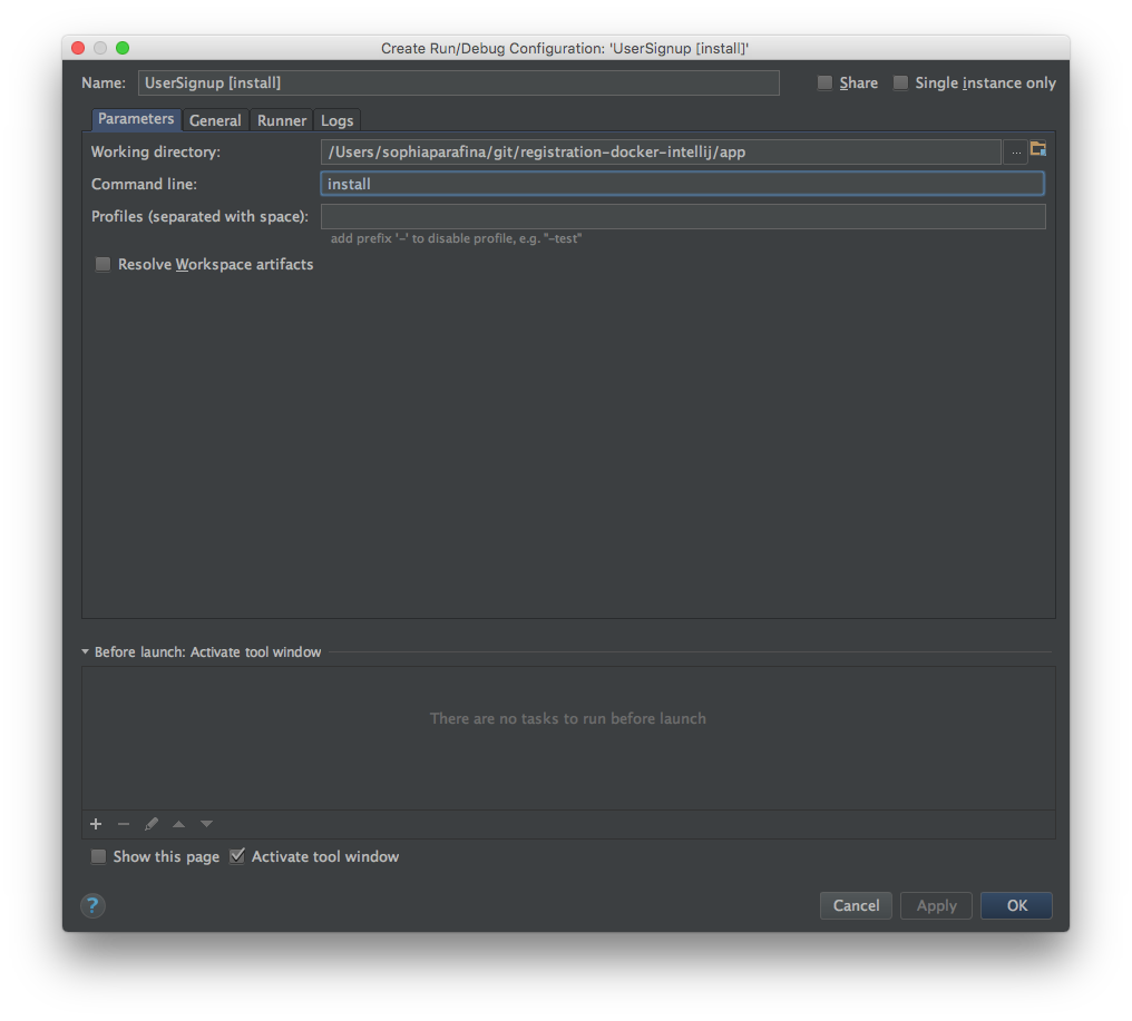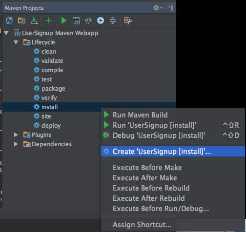 Configure the install goal similarly. Click on install in the Lifecycle tree. Select Create 'UserSignup[install]'...