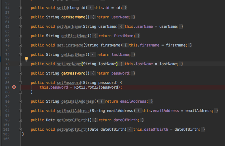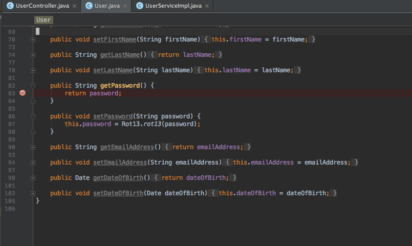 Next, set a breakpoint on the getPassword in the User class to see the value returned for password. You can also toggle off the breakpoint for setPassword.