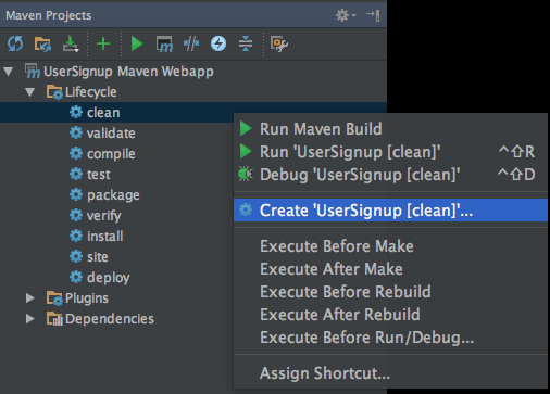 To set the clean goal, click on Lifecycle to display the tree of goals. Right click on clean and select Create 'UserSignup [clean]'...