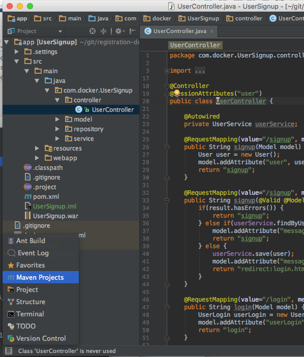 Docker will build the images for Apache Tomcat and MySQL then start the containers. It will also mount the application directory (./app/target/UserSignup) as a data volume on the host system to the Tomcat webapps directory in the web server container.