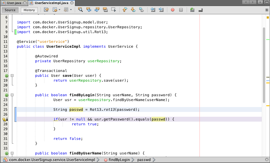 Next, set a breakpoint on the getPassword in the User class to see the value returned for password. You can also toggle off the breakpoint for setPassword. Try to log into the application. Look at the value for password in the NetBeans variables window, note that it is z0ol which is m0by using ROT13.