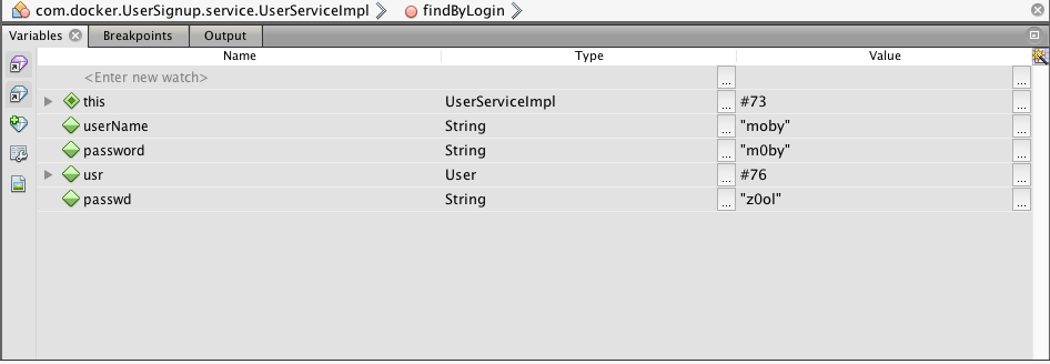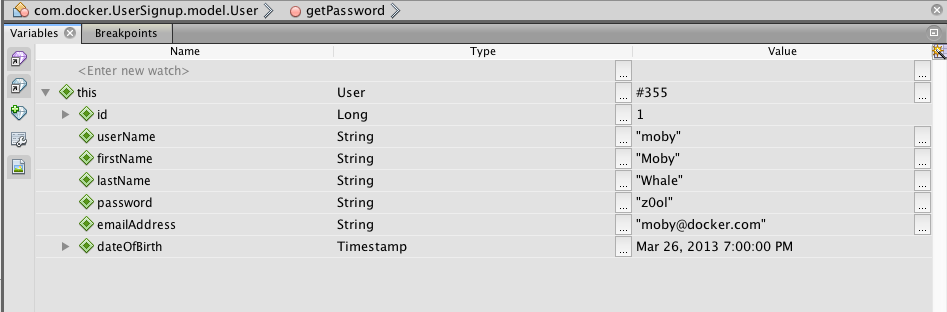 Set a breakpoint in UserServiceImpl on the findByLogin method. Press F11 or click on Run > Build Project to update the deployed code. Log in again and look at the values for the breakpoint. The ‘passwd’ variable is z0ol which matches the password for the user moby.