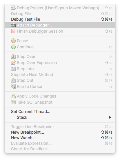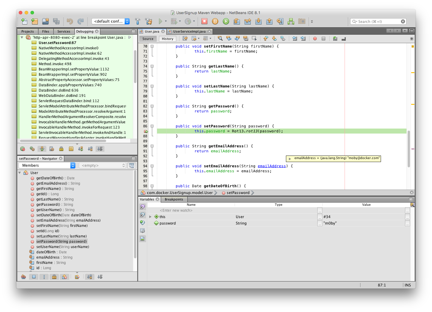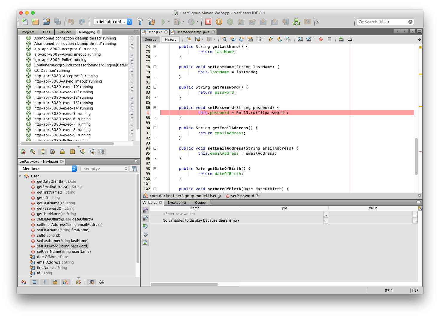Since we enabled remote debugging earlier, you should see the Daemon Threads for Tomcat in the Debugging window. Set a breakpoint for in the User class where the password is set.